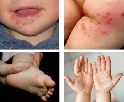 临床表现多以发热、口腔黏膜疱疹及手、足和臀部出现斑丘疹、疱疹为主,可伴有咳嗽、流涕、食欲缺乏等症状。患儿通常症状较轻,呈自限性,一般预后良好,7-10天病程后可完全康复。